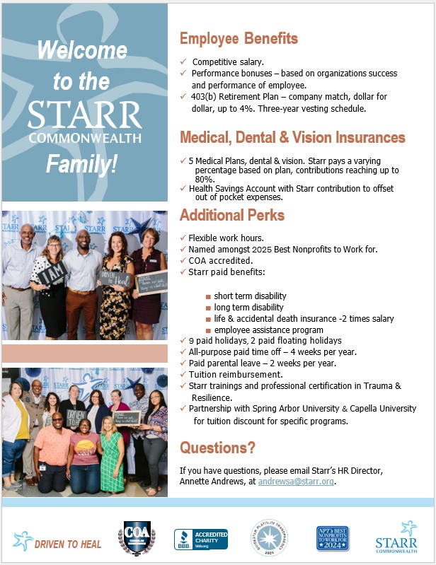 - Demonstrates a clear understanding of Starr Commonwealth’s mission and core values, and consistently aligns actions with Starr’s mission and its core values of seeing greatness, finding courage, promoting health, fostering healing, and oneness.