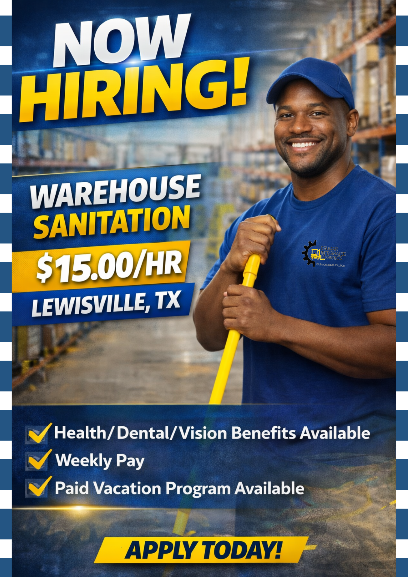 Sanitation associates are responsible waste/dump disposal area, office restrooms, break room, sales area, and the shipping office as well as general warehouse cleaning and painting as required and some assisting in warehouse environment (pulling and receiving). The Sanitation employees play and active role in the overall appearance of the entire warehouse.