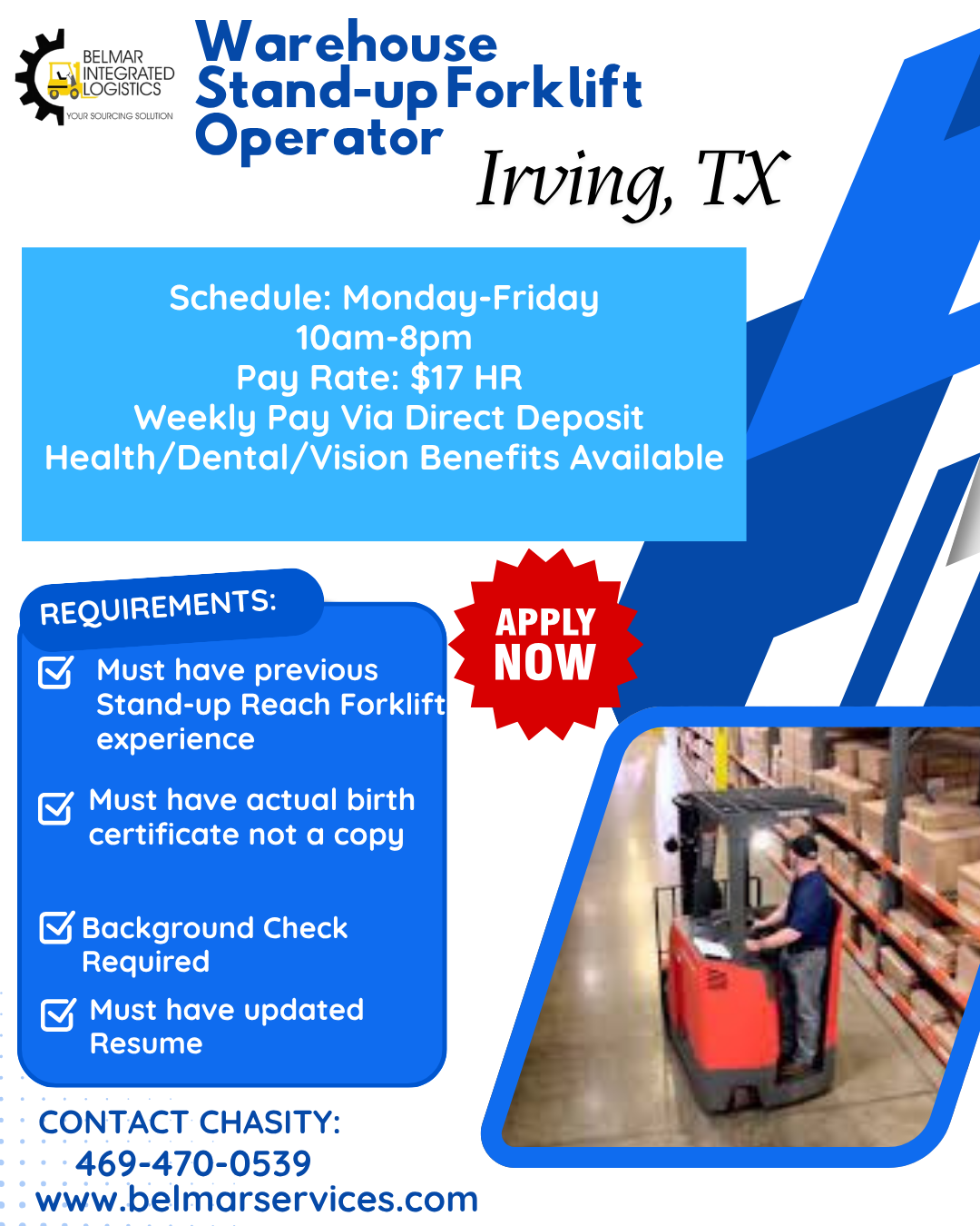 You can begin with Belmar earn great money and move through the ranks to a career in warehouse management, training or other specialties.
