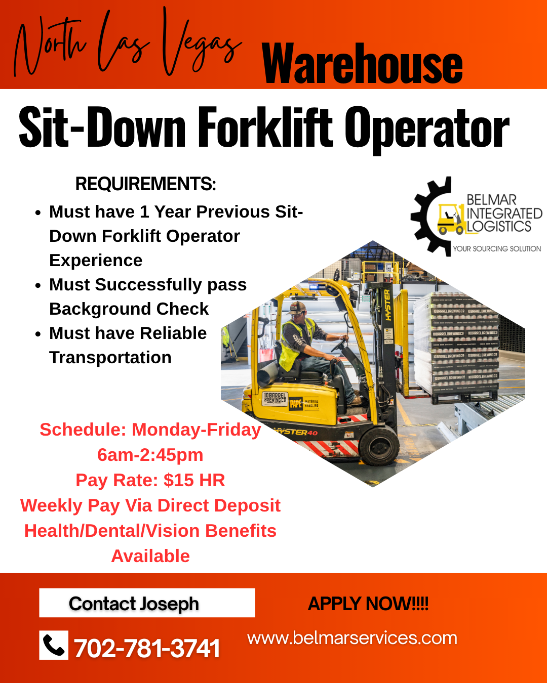 Must have 1 year of experience operating Sit-Down Forklift/Counterbalance Forklift