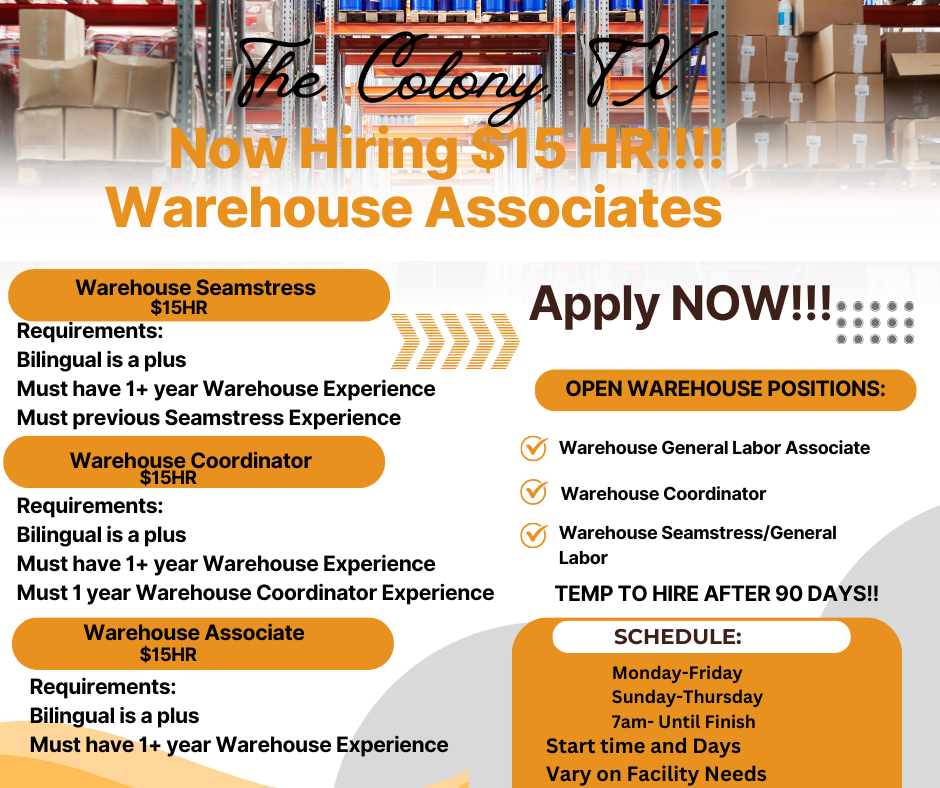 Bilingual Warehouse Seamstress/General Labor Associate $16HR