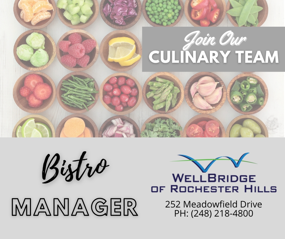 In collaboration with the Executive Chef, the Bistro Manager is responsible for assisting in directing the overall operation of the Bistro in accordance with current federal, state, and local standards, guidelines, and regulations governing the facility, to assure that quality services are provided on a daily basis and that the Bistro is maintained in a clean, safe, and sanitary manner.