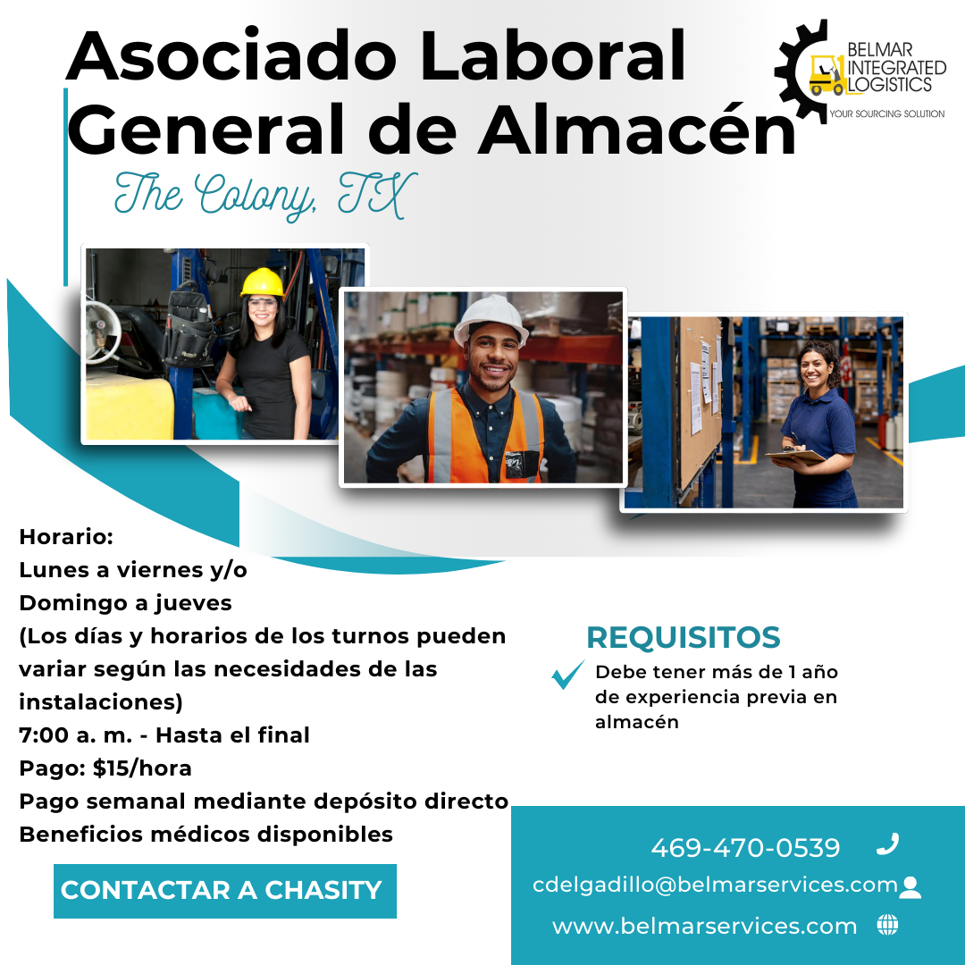 SALARIO: $15.00/hora (primeros 90 días) MÁS seguro médico, dental y de la vista disponible. Después de 90 días, $16.00/hora y tendrá acceso a todos los beneficios de la empresa.